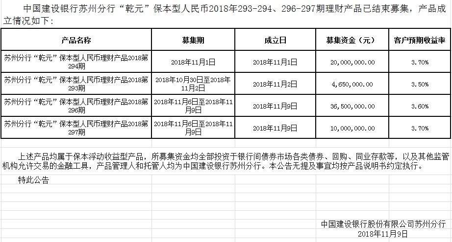 中国建设银行苏州分行“乾元”保本型人民币2018年293-294、296-297期理财产品成立公告