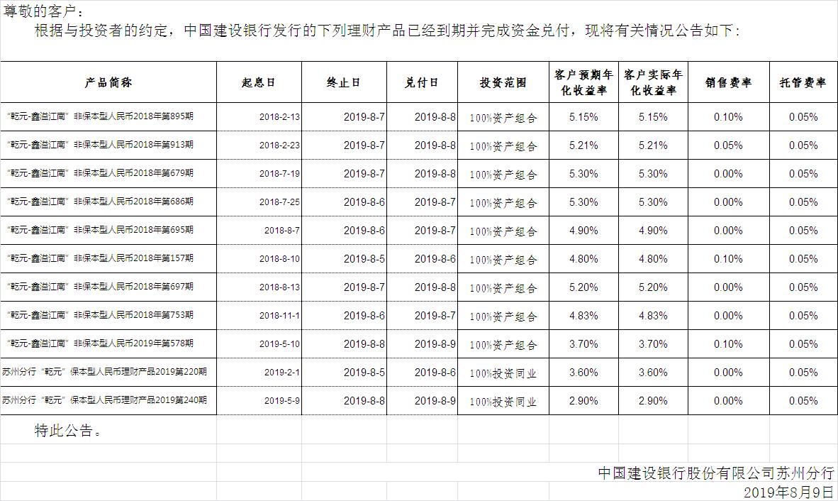 中国建设银行理财产品终止及清算公告